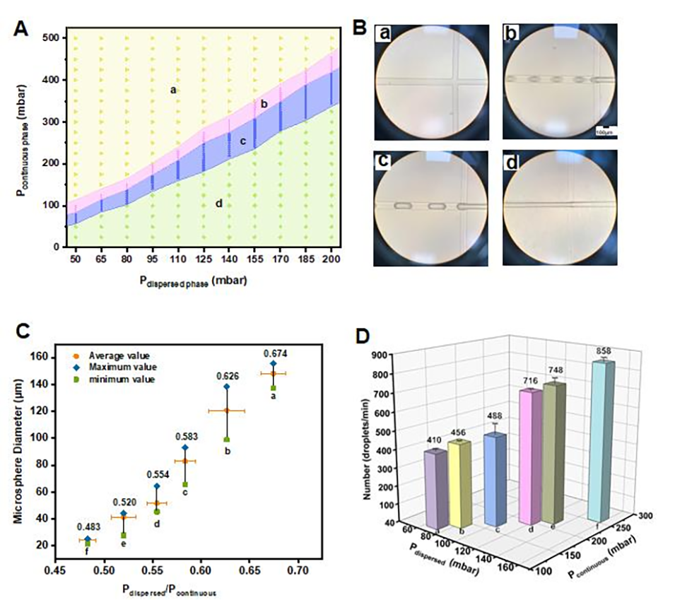 2、通过调整两相气压比,可精确控制Pickering滴液的尺寸(25至150微米),其变异系数低于4.5%,展现出高度均一性和单分散性。