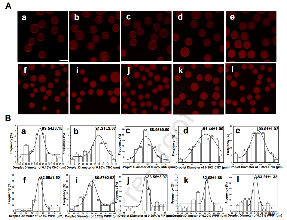 图4.(A)Pickering液滴的共聚焦激光扫描显微镜(CLSM)图像:CNC稳定的液滴(a-e)和WPIF稳定的液滴(f-l)。比例尺为100μm。分散在水相中的CNC和WPIF因荧光染色呈红色。(B)CNC(a-e)和WPIF(f-l)稳定的Pickering液滴的尺寸分布范围。右上角数值表示平均粒径。颗粒浓度从左到右依次为0.15%、0.20%、0.25%、0.30%、0.35%。