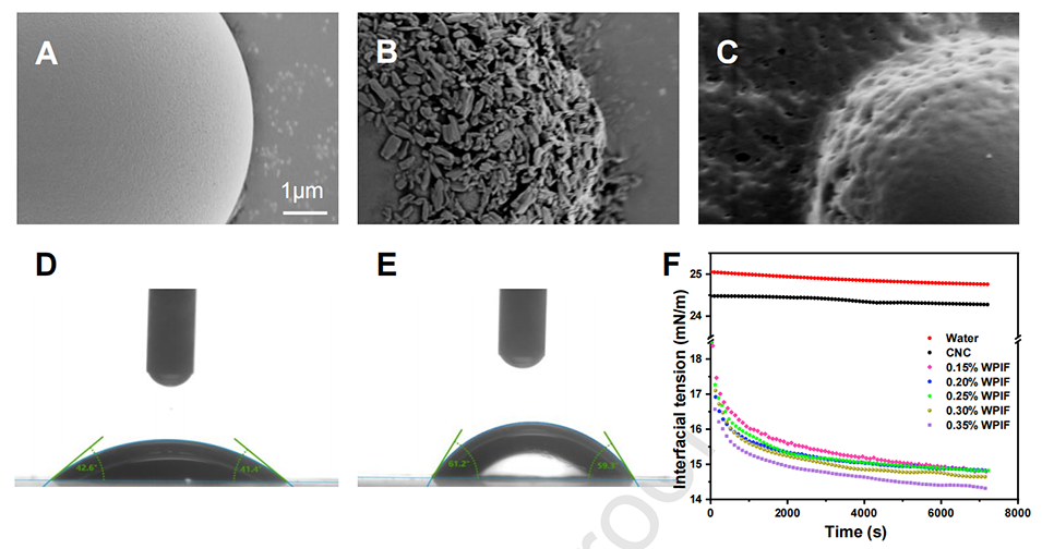 图5. 模拟吸附的扫描电镜(SEM)图像:空白聚苯乙烯(PS)微球(A)、CNC吸附微球(B)、WPIF吸附微球(C)。CNC或WPIF膜-油-水三相接触角图像:CNC膜(D)、WPIF膜(E)。CNC和WPIF在MCT-水界面的界面张力随时间的变化曲线(F)。