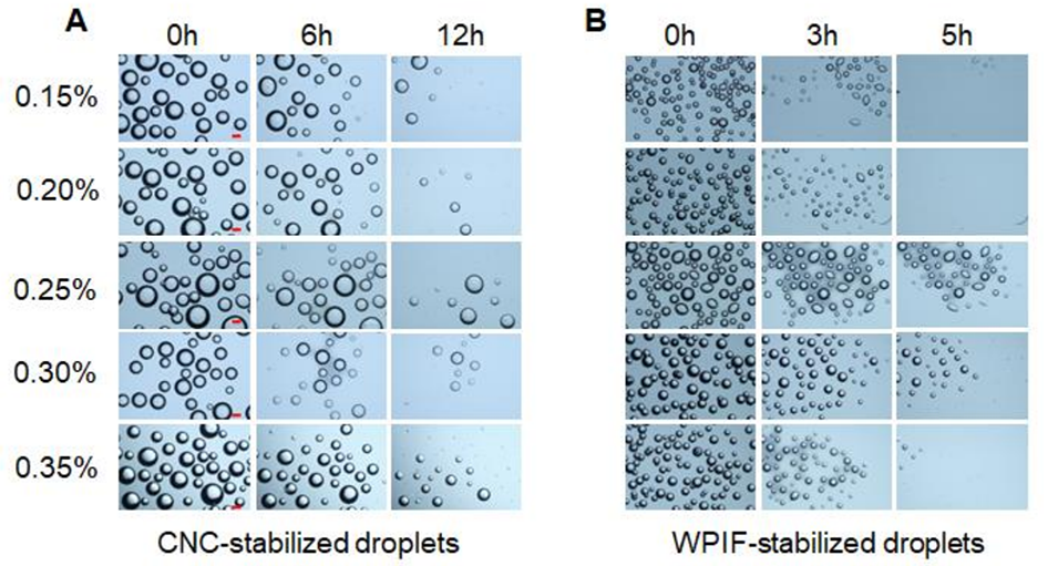 图6. Pickering液滴的稳定性图像:CNC稳定的液滴(A)、WPIF稳定的液滴(B)。