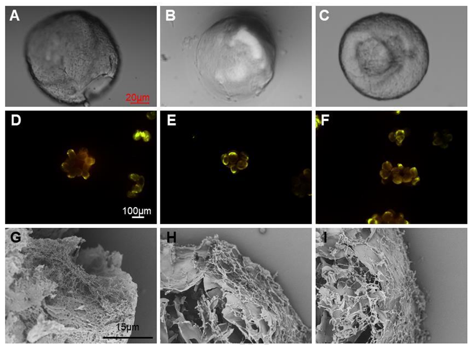 图7. 海藻酸钠(SA)微球的显微图像(A)、荧光图像(D)和扫描电镜图像(G)。CNC-SA微球的显微图像(B)、荧光图像(E)和扫描电镜图像(H)。WPIF-SA微球的显微图像(C)、荧光图像(F)和扫描电镜图像(I)。(D-F)中的微球和MCT分别呈现绿色和红色荧光。