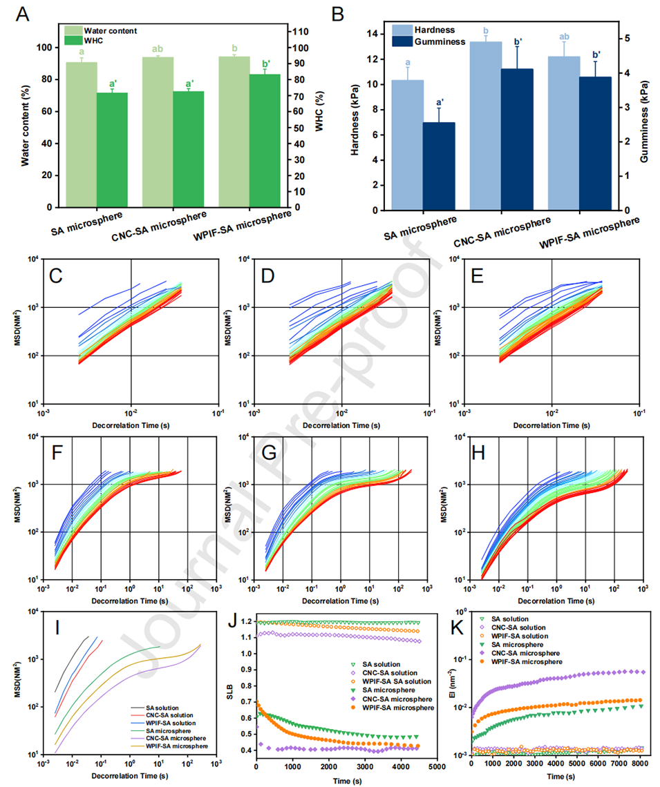 图8.(A)微球的含水量和持水能力(WHC)。(B)微球的硬度和粘性。不同分散相和微球的均方位移(MSD)曲线:SA溶液(C)、CNC-SA溶液(D)、WPIF-SA溶液(E)、SA微球(F)、CNC-SA微球(G)、WPIF-SA微球(H)。(I)2000秒时不同分散相和微球的MSD曲线。不同分散相和微球的固液平衡(SLB)(J)和弹性指数(EI)(K)。