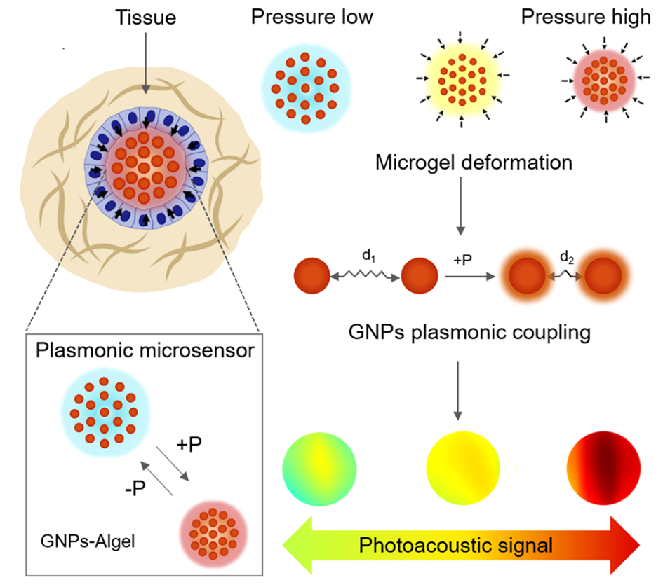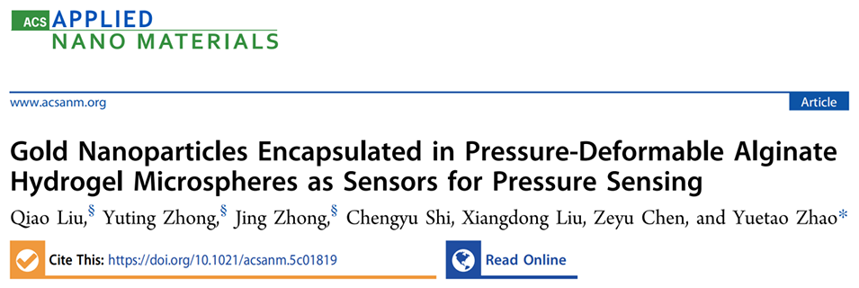 机械压力感知在生物过程中扮演着至关重要的角色,然而由于检测技术的匮乏以及传感器难以有效接近组织,相关感知工作面临极大挑战。近期,中南大学生命科学学院赵岳涛副教授团队开发出一种基于纳米光机械转换器的等离子体微传感器,通过将金纳米颗粒高密度封装于可压变形的海藻酸盐水凝胶微球中,实现了从溶液到生物组织的压力传感,为活体组织压力监测提供了新平台。相关研究以“Gold Nanoparticles Encapsulated in Pressure-Deformable Alginate Hydrogel Microspheres as Sensors for Pressure Sensing”为题,发表在期刊《ACS Applied Nano Materials》上。