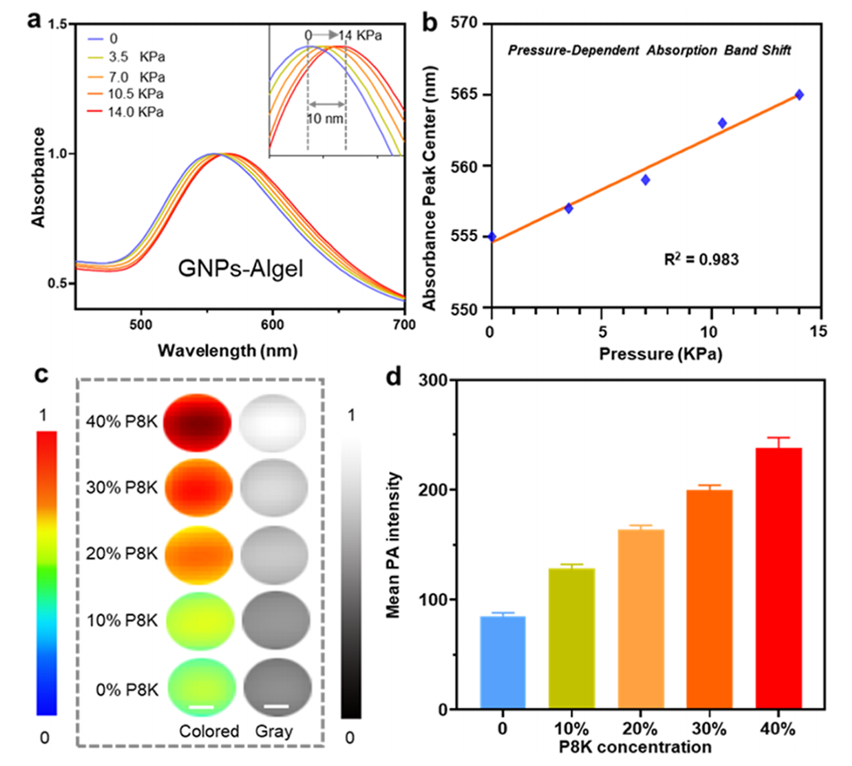 图3. GNPs-Algel在溶液水平的压力传感。(a) GNPs-Algel在不同压力下的吸收光谱。(b) GNPs-Algel的吸光度峰值质心与压力的相关性。(c)彩色和灰度光声信号。(d)计算得到的GNPs-Algel在不同浓度P8K溶液中的平均光声强度。比例尺:0.1mm。