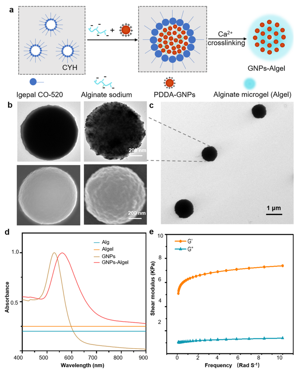 图2.等离子体微传感器的构建与表征。(a) GNPs-Algel的制备示意图。(b)海藻酸盐水凝胶(左)和GNPs-Algel(右)的透射电镜(上)和扫描电镜(下)图像。(c)多个GNPs-Algel微粒的透射电镜图像。(d) GNPs-Algel的紫外-可见-近红外光谱。(e)采用剪切流变学测得的GNPs-Algel的流变学特性。