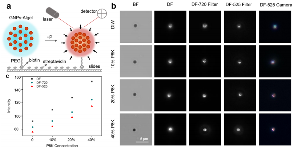 图4. GNPs-Algel在单颗粒水平的压力传感。(a)将GNPs-Algel固定在载玻片表面以观察单颗粒在压力变化下的形变和光学信号的示意图。(b)采用暗场散射显微镜观察单个颗粒在不同浓度P8K溶液中的代表性图像,分别为明场(BF)、暗场(DF)以及配备720nm和525nm滤光片的暗场(DF-720滤光片和DF-525滤光片)。最右侧图(DF-525相机)为在DF-525滤光片下通过CCD相机拍摄的微传感器图片。比例尺:5μm。(c)由图(b)计算得到的微传感器在不同P8K溶液中的散射光强度。