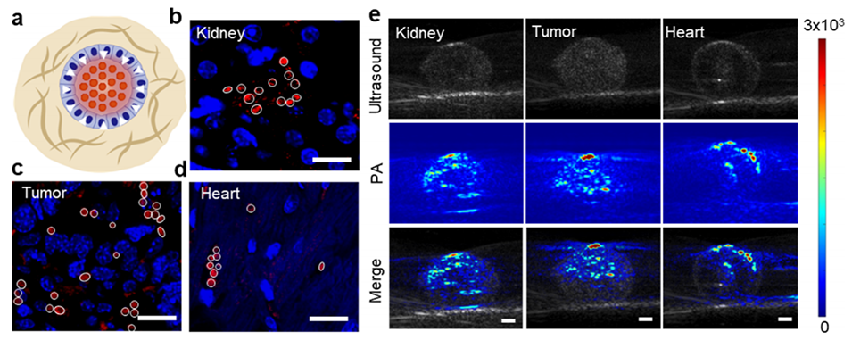 图5. GNPs-Algel在组织水平的生物压力传感。(a)微传感器用于组织中生物压力传感的示意图。(b)肾脏、(c)肿瘤和(d)心脏注射Cy5标记的海藻酸盐水凝胶后的DAPI(4',6-二脒基-2-苯基吲哚)染色图像。比例尺:5μm。(e)含有GNPs-Algel微传感器的不同离体组织的光声成像。比例尺:0.2mm。