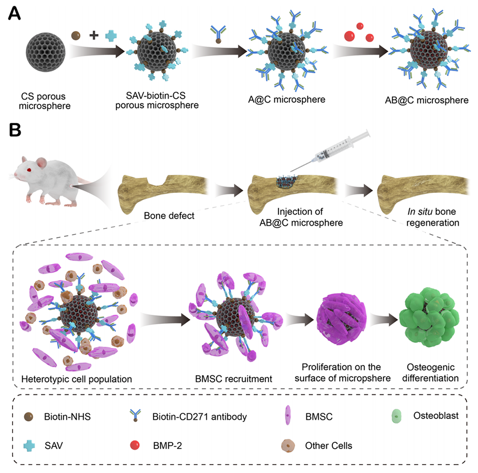 目前,骨缺损仍是临床治疗的重大挑战,在缺损部位募集靶细胞并诱导其分化为骨组织是有效的治疗方法。在此前研究中,用CD271抗体构建了骨髓间充质干细胞(BMSC)募集微球以治疗骨缺损,但微球本身骨传导性差,并且系统缺乏骨诱导性,这严重影响了修复效率。