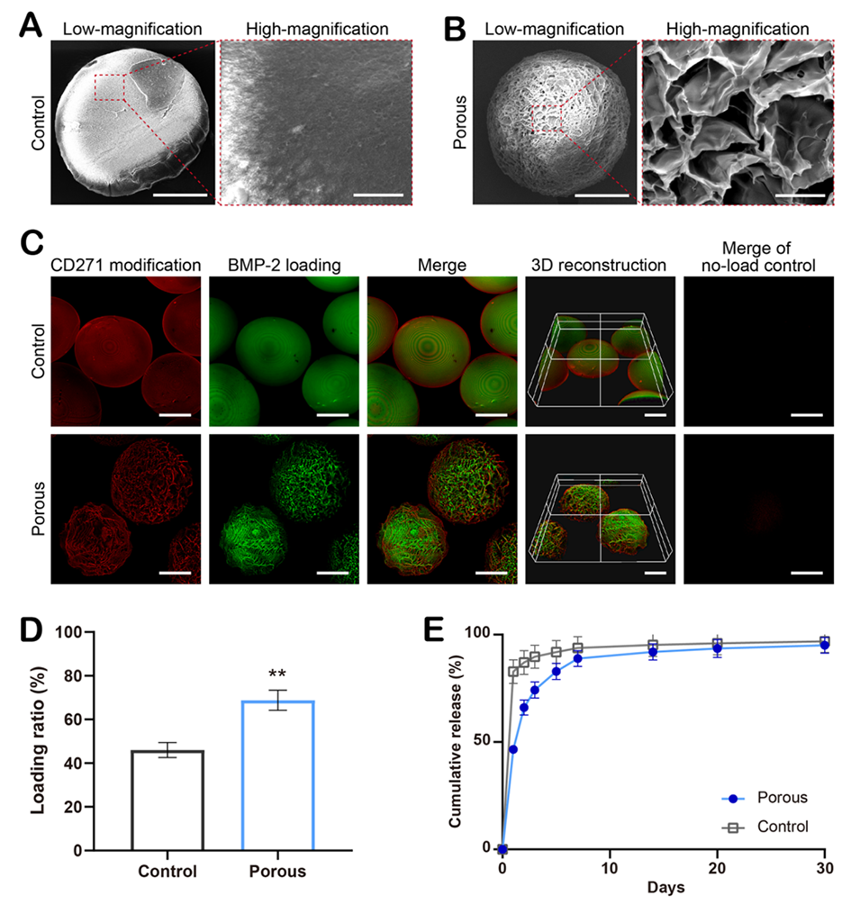 2、通过生物素-链霉亲和素体系偶联CD271抗体(能特异性识别并结合BMSC表面的CD271抗原),进一步在微球孔隙结构中负载骨形态发生蛋白-2(BMP-2),得到具有BMSC募集和成骨分化诱导功能的可注射微球。