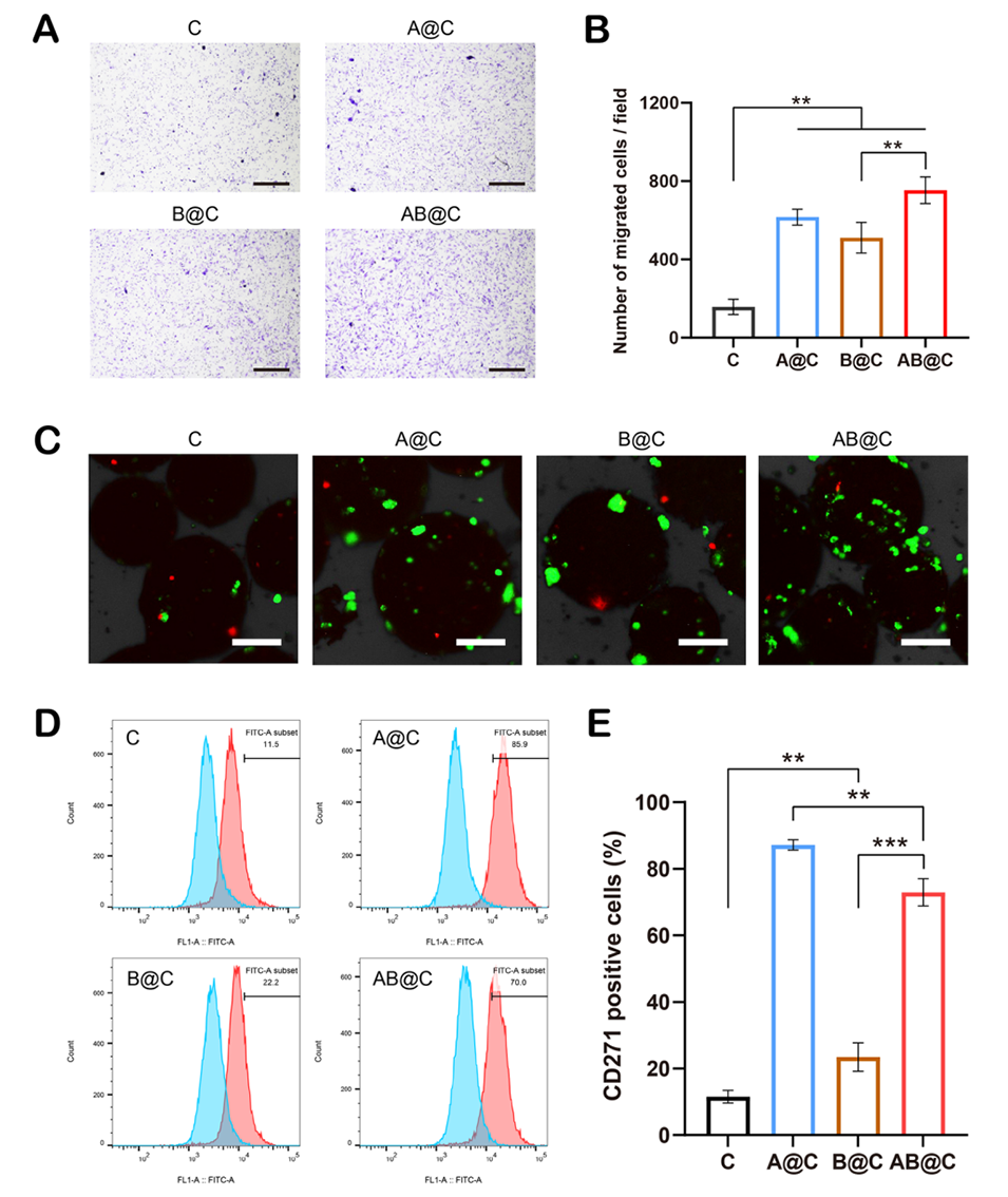 图3. AB@C微球招募骨髓间充质干细胞(BMSC)的能力