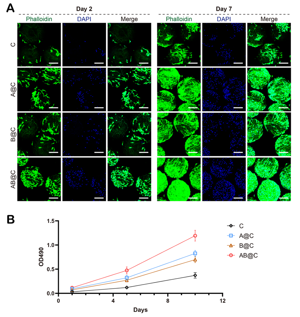 图4.骨髓间充质干细胞(BMSC)在微球表面的黏附与增殖情况
