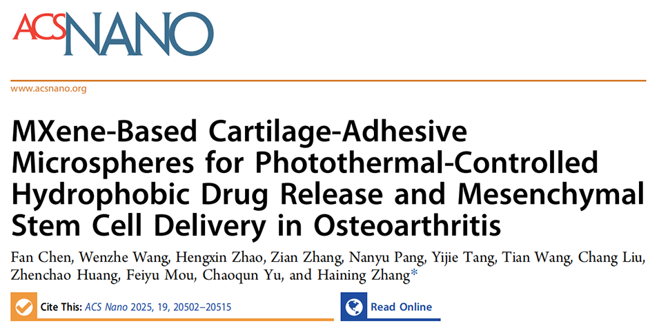 近期,青岛大学附属医院关节外科张海宁教授团队开发出一种基于MXene的软骨粘附微球系统,该系统可实现光热控制疏水性药物释放及间充质干细胞递送,为骨关节炎治疗提供了新策略。相关研究以“MXene-Based Cartilage-Adhesive Microspheres for Photothermal-Controlled Hydrophobic Drug Release and Mesenchymal Stem Cell Delivery in Osteoarthritis”为题目,发表在期刊《ACS Nano》上。