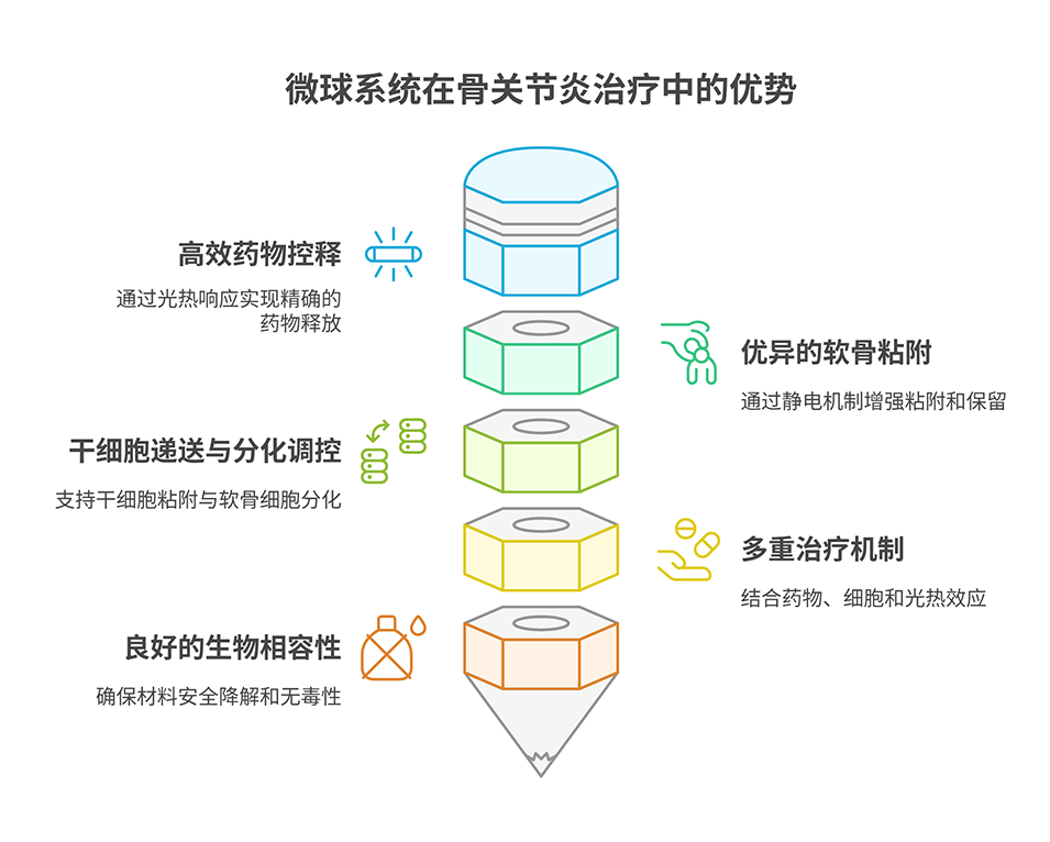 4、同时,温和热疗诱导软骨细胞中热休克蛋白70(HSP70)的表达,提供保护作用并延缓OA进展。该多功能微球系统为OA治疗提供了可控药物释放和干细胞递送的新策略。