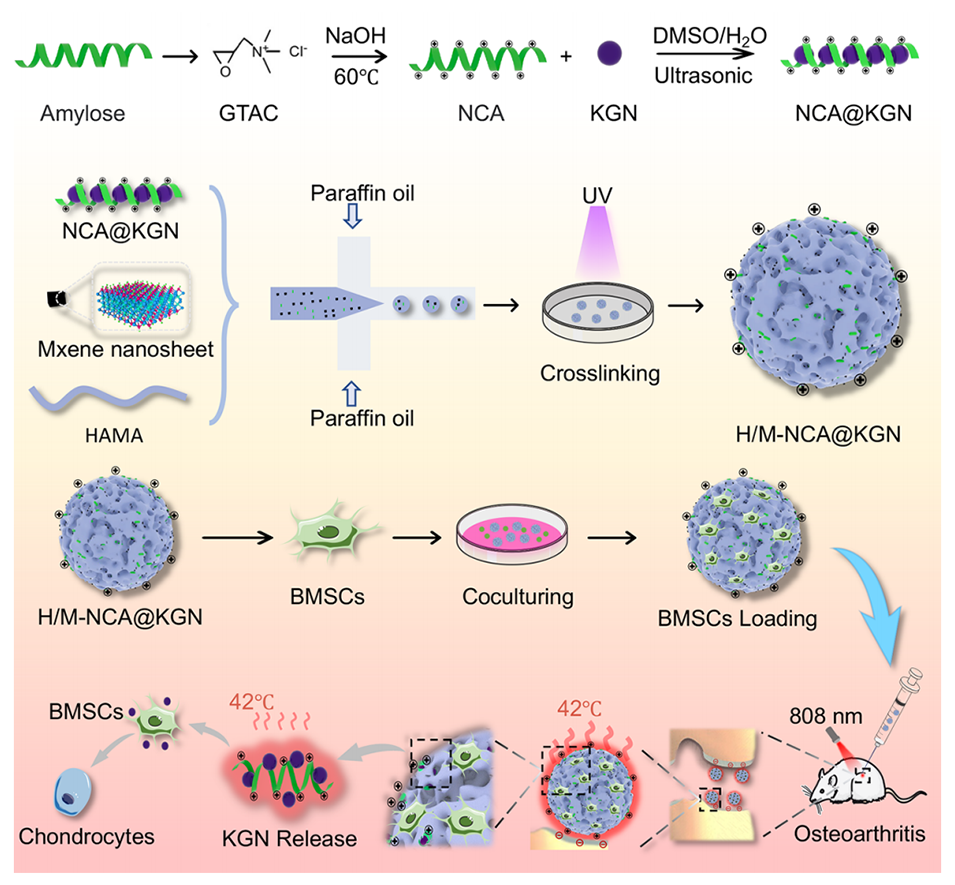 1、本研究开发了一种基于MXene的软骨粘附微球(H/M-NCA@KGN)。通过阳离子化直链淀粉(NCA)封装疏水药物Kartogenin(KGN)形成NCA@KGN复合物,再与甲基丙烯酰化透明质酸(HAMA)和MXene通过微流控制备成微球。