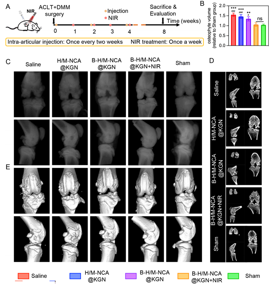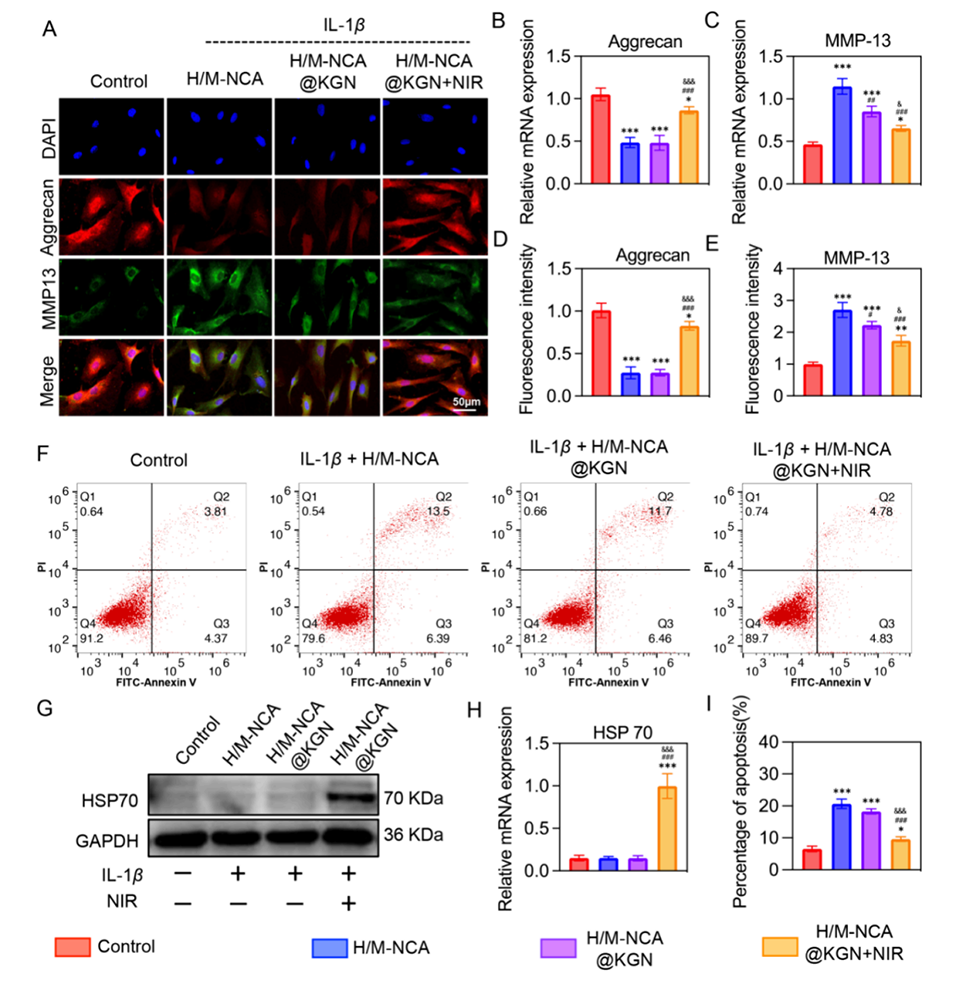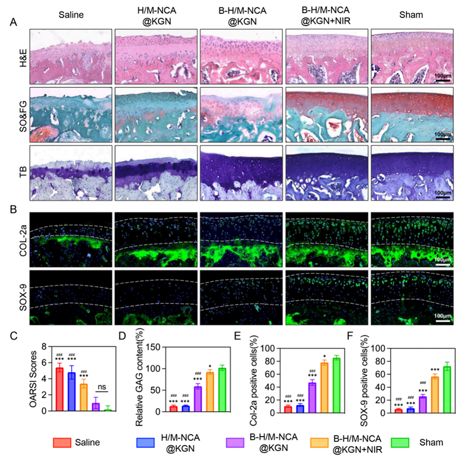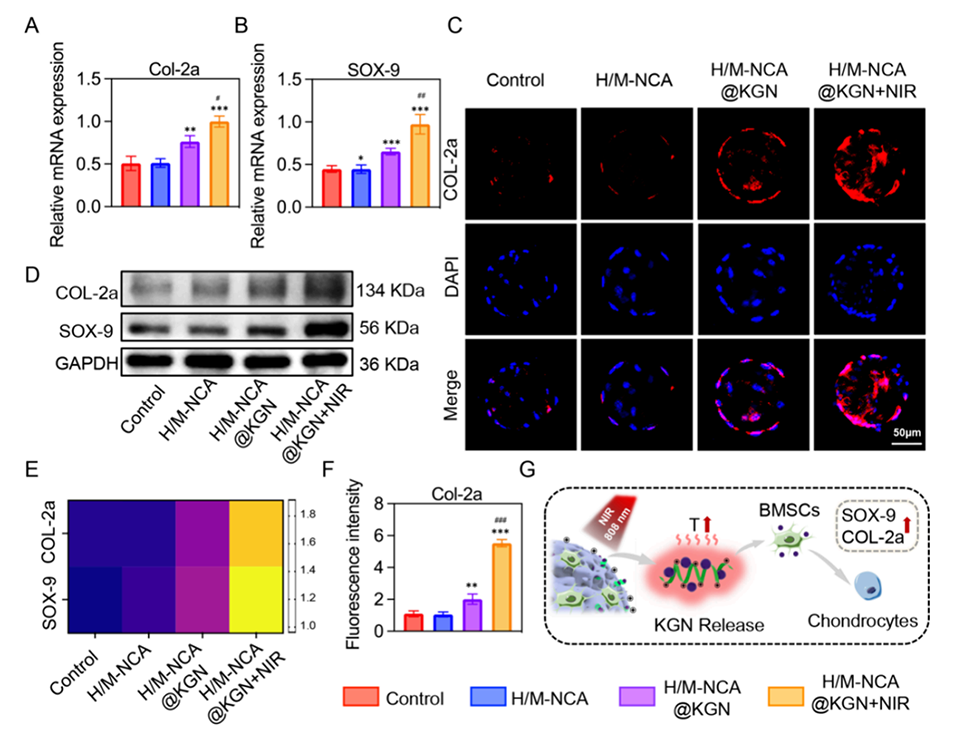 3、在近红外(NIR)光照射下,MXene产生热量(约42°C),实现KGN的光热控释。释放的KGN促进BMSCs向软骨细胞分化,改善关节软骨细胞外基质丢失。