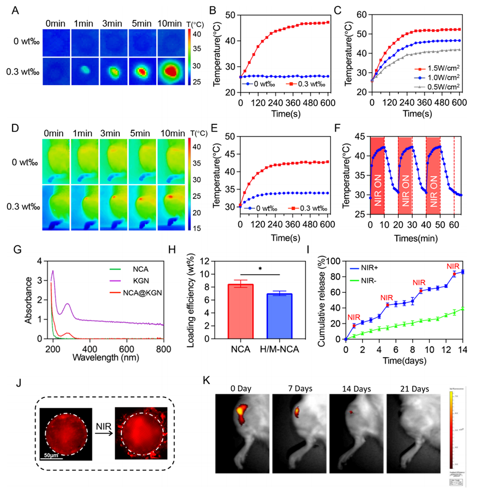 图2. H/M-NCA@KGN微球的光热性能与药物释放行为表征