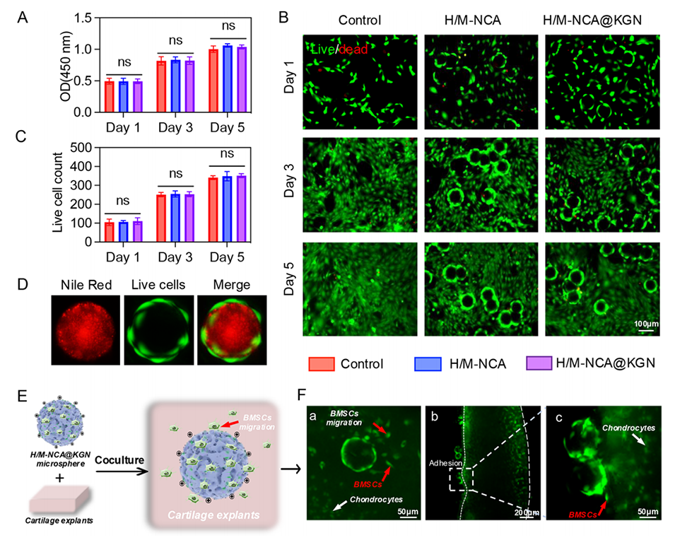 2、该微球具有良好的生物相容性,能有效粘附在软骨表面并携带骨髓间充质干细胞(BMSCs)。