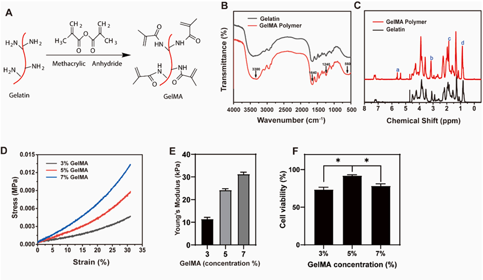 图1. GelMA的表征。A)GelMA的合成。B)GelMA的红外光谱图,证实了甲基丙烯酸酯基团的存在。C)GelMA的核磁共振(NMR)光谱图,用于验证甲基丙烯酰化程度。D)不同浓度GelMA的弹性模量曲线,显示出其机械性能的可调性。E)不同浓度GelMA的杨氏模量。F)不同浓度GelMA的细胞存活率(*: P<0.05)。