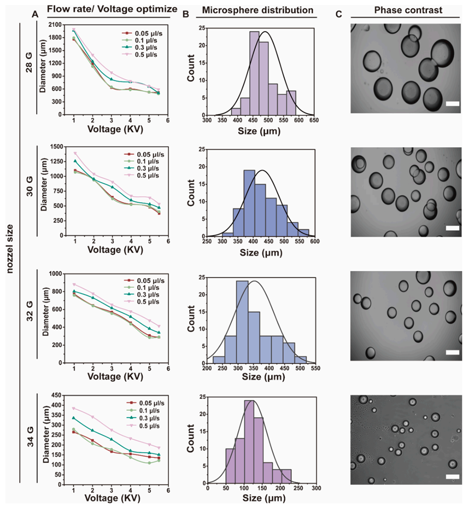 图2.微球直径的打印参数优化。A)电压、流速和喷嘴尺寸对微球直径的影响。B)不同喷嘴下最佳打印参数的粒径分布图。C)不同喷嘴下最佳打印参数的相差显微镜图像,比例尺为300μm。