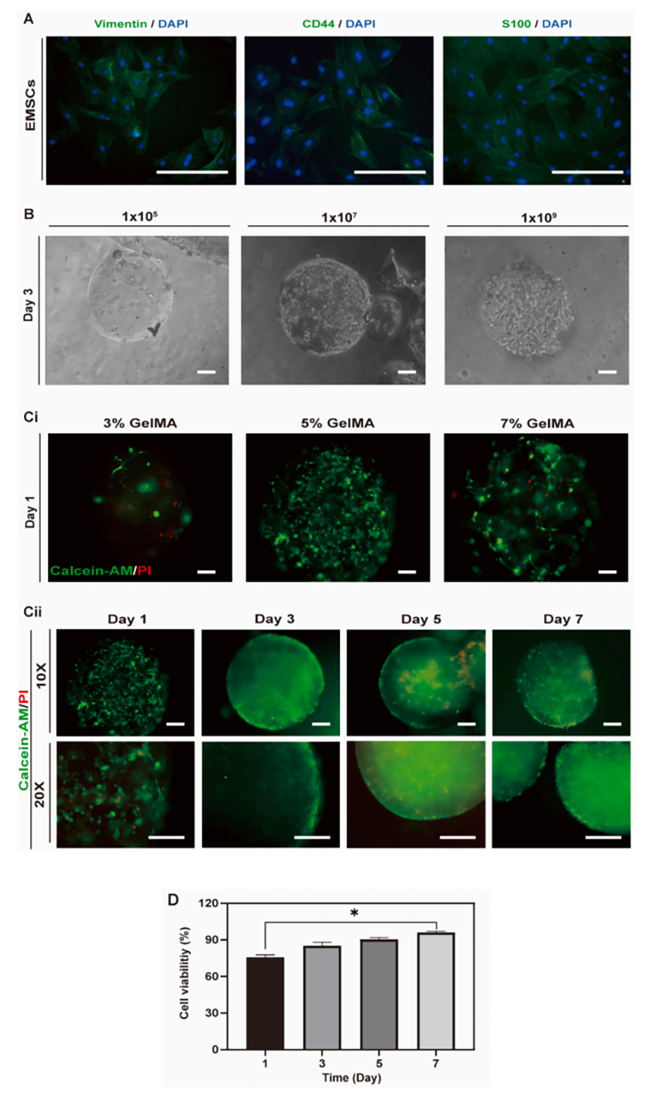 1、本研究通过静电喷雾技术制备了负载外胚间充质干细胞(EMSCs)的GelMA水凝胶微球。