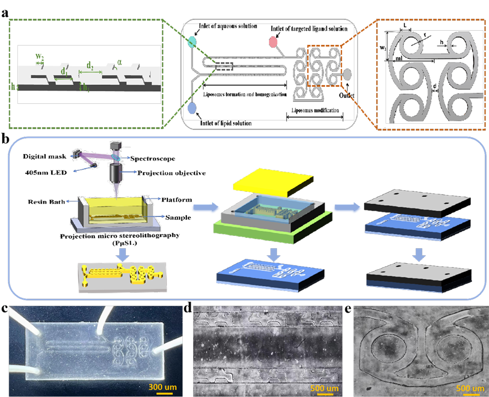 (a微混合器详细信息(尺寸、组成、入口);b制备流程图;c微混合器实物图;d、e微通道超景深显微镜图)