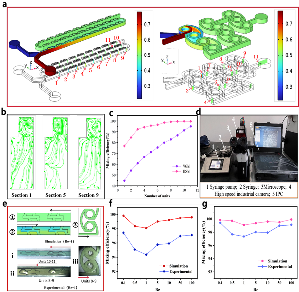 (a 仿真质量云图;b VGM不同截面的流线分布;c两种结构不同混合单元数下的混合效率;d 实验装置;e 局部实验图对比仿真图;f、g 数值模拟与实验数据对比)