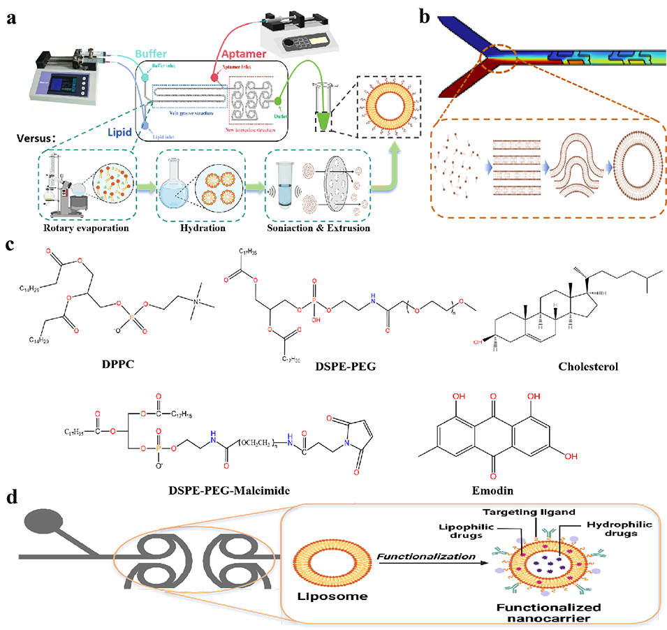 图3:一步形成靶向脂质体机制。(a VGHM与薄膜水合法制备靶向脂质体的对比示意图;b VGM中脂质体的自组装形成过程;c脂质体成分的化学结构;d 靶向脂质体形成的机制)
