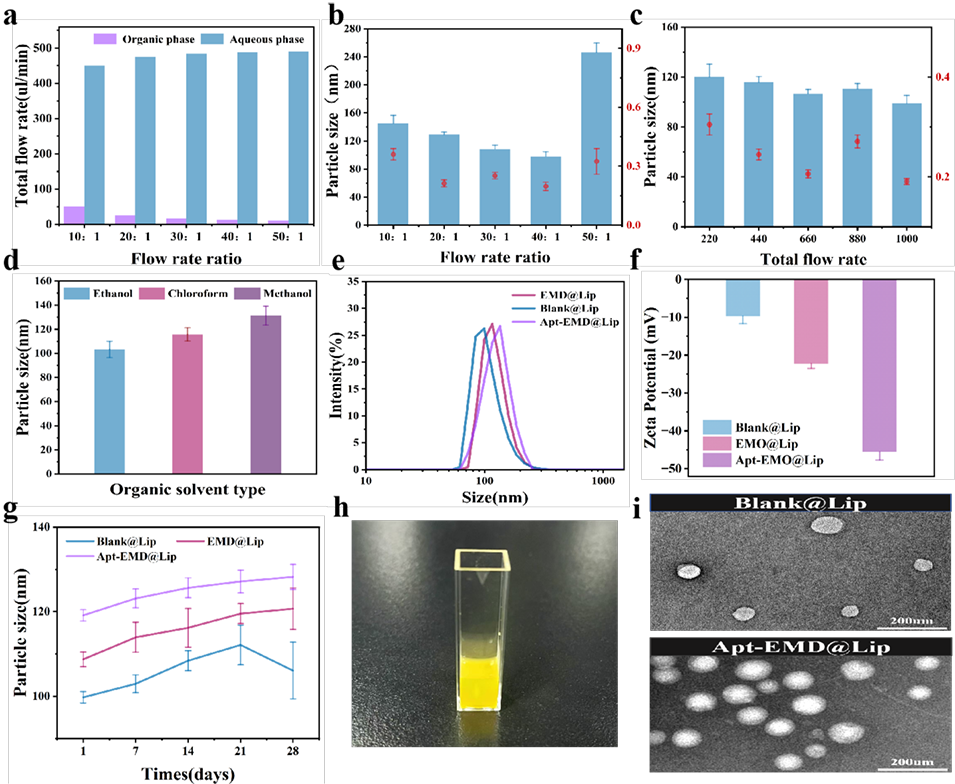 图4:制备参数对脂质体的特性影响图。(a)流量信息配置(b)FRR对粒径和PDI的影响。(c) TFR对粒径和PDI的影响。(d) 溶剂类型对粒径的影响。(e) Blank@Lip、EMO@Lip和Apt-EMO@Lip的粒径分布。(f) Blank@Lip、EMO@Lip和Apt-EMO@Lip的Zeta电位值。(g)Blank@Lip、EMO@Lip和Apt-EMO@Lip在4℃储存条件下的长期稳定性。(h) 纯化的Apt-EMO@Lip样品图。(i) TEM图像显示Blank@Lip和Apt-EMO@Lip的球形形态(标尺=200 nm)。