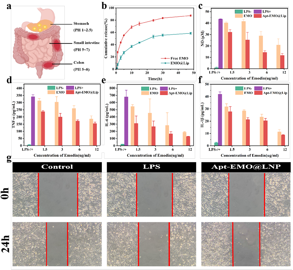 (a 胃肠道的pH范围示意图;b Free EMO和EMO@Lip的体外累积释放曲线;c-f RAW264.7细胞分泌的促炎因子NO 、TNF–α 、IL–6 和IL-1β 的评价,处理24小时;g 对caco-2细胞划痕实验0-24h小时效果)