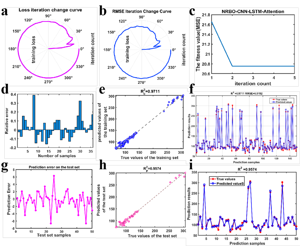 图5:机器学习预测粒径图。(a)训练损失随迭代次数变化图(b)均方根误差(RMSE)随迭代次数变化图(c)模型训练适应度曲线(d)相对误差图(e)训练集样本拟合度(f)训练集预测值与真实值对比(g)测试集样本的预测误差分布(h)测试集样本拟合度(i)测试集预测值与真实值对比