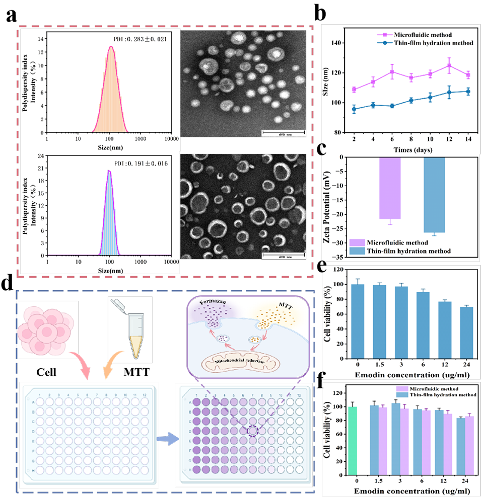 (a微流控法和薄膜水合法制备的载药脂质体的粒径分布和形态对比;b稳定性对比;c电位对比;d MTT实验示意图;e游离大黄素的细胞毒性测定;f两方法制备的载药脂质体的细胞毒性测定)