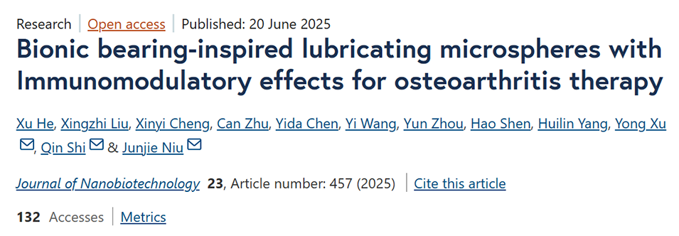 近期,苏州大学骨科研究所徐勇教授、施勤教授、钮俊杰等人开发了一种具有免疫调节功能的仿生轴承启发润滑微球(LFDCS),该微球通过微流控技术制备,以硫酸软骨素和甲基丙烯酰化丝胶蛋白为骨架,结合叶酸靶向脂质体,实现了对骨关节炎的“润滑-抗炎-修复”三位一体治疗。相关研究以“Bionic bearing-inspired lubricating microspheres with Immunomodulatory effects for osteoarthritis therapy”为题目,发表在期刊《Journal of Nanobiotechnology》上。