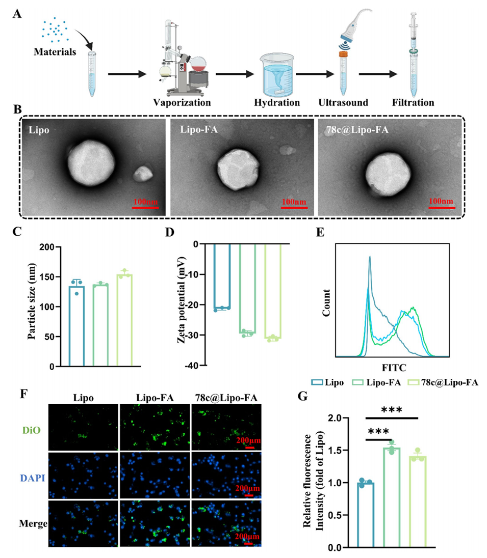 图1. 78c@Lipo-FA的表征。(A) Lipo-FA的制备流程示意图,材料包括78c、氢化大豆磷脂(HPSC)、胆固醇、十八胺和DSPE-PEG2k-FA。(B)脂质体的透射电镜(TEM)图像。(C)脂质体的粒径分布(n=3)。(D)脂质体的zeta电位(n=3)。(E)流式细胞术检测骨髓来源巨噬细胞(BMMs)摄取脂质体的代表性图。(F)荧光显微镜下BMMs摄取脂质体的代表性图像(BMMs孵育4小时后)。(G) BMMs摄取脂质体的相对荧光强度(n=3)。***p<0.001