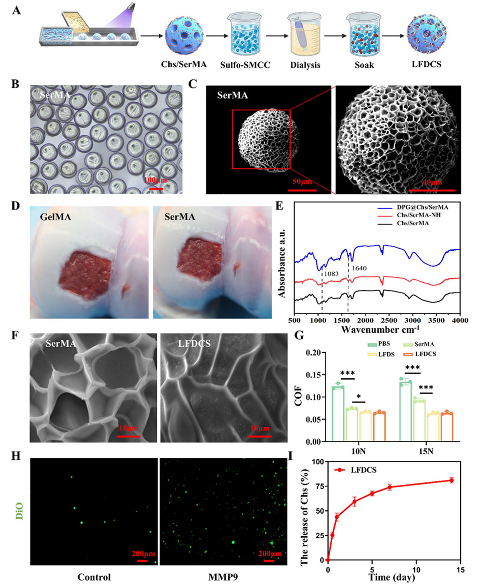 图2. LFDCS的表征。(A) LFDCS的制备流程示意图。(B)光学显微镜下观察到的SerMA水凝胶微球形态。(C) SerMA水凝胶微球的代表性扫描电镜(SEM)图像。(D) GelMA和SerMA水凝胶微球在猪软骨上的黏附情况大体观察。(E) DPG@Chs/SerMA、Chs/SerMA-NH和Chs/SerMA的傅里叶变换红外光谱(FTIR)。(F) SerMA和LFDCS的代表性SEM图像。(G) PBS、SerMA、LFDS和LFDCS的摩擦系数(COF)直方图(n=3)。(H)荧光显微镜下观察LFDCS中脂质体的响应性释放。(I) LFDCS中硫酸软骨素(Chs)的释放曲线(n=3)。*p<0.05,***p<0.001
