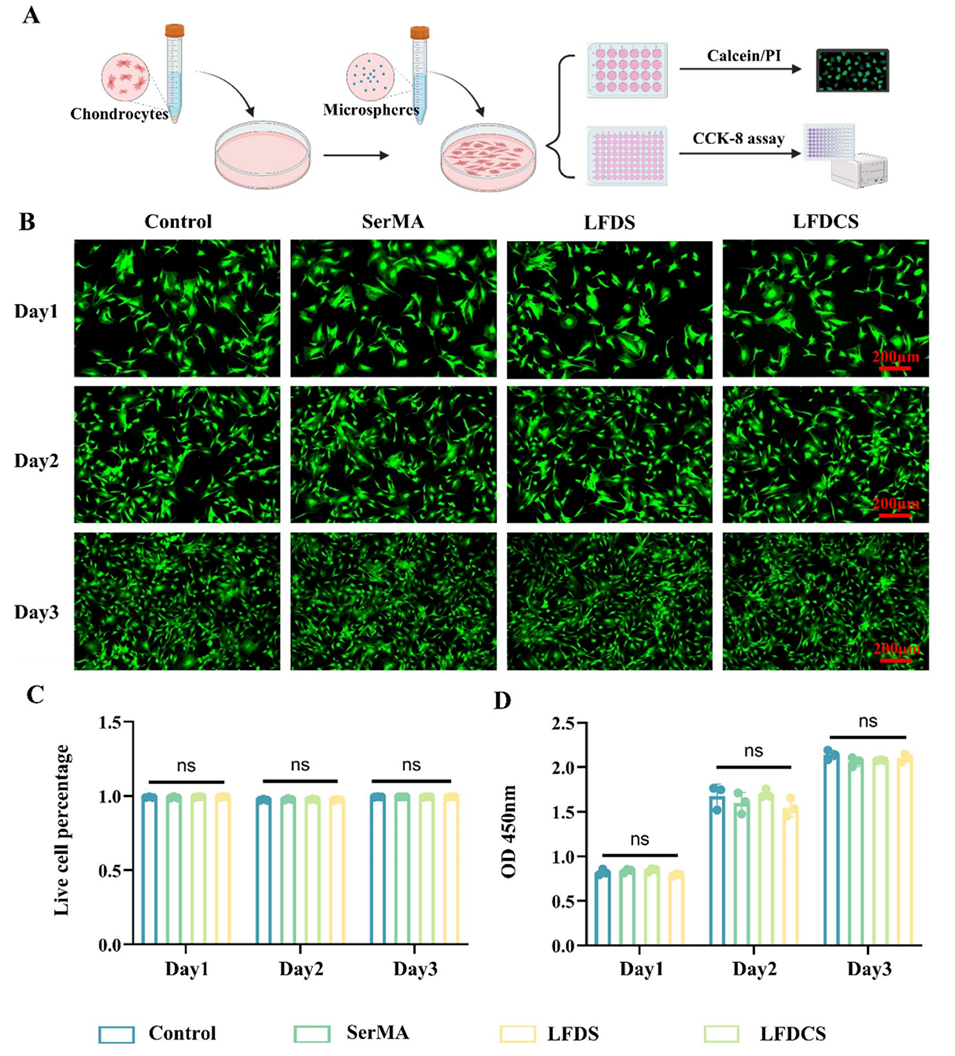 图3. LFDCS的生物相容性。(A)材料生物相容性检测流程示意图。(B,C)第1、2、3天软骨细胞的Calcein/PI染色及定量分析(n=3)。(D)第1、2、3天软骨细胞活力的CCK8检测(n=3)。ns表示无显著差异