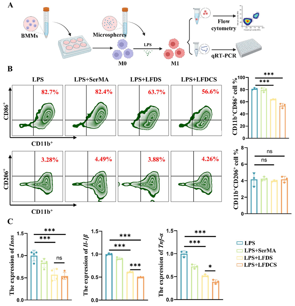 图4. LFDCS抑制巨噬细胞向M1表型极化。(A)微球干预巨噬细胞极化的流程示意图。(B)流式细胞术检测24h时CD11b+CD86+(M1表型)和CD11b+CD206+(M2表型)的比例(n=3)。(C) qRT-PCR检测24h时M1极化相关基因(Inos、Il-1β和Tnf-α)的表达(n=3)。*p<0.05,***p<0.001,ns表示无显著差异