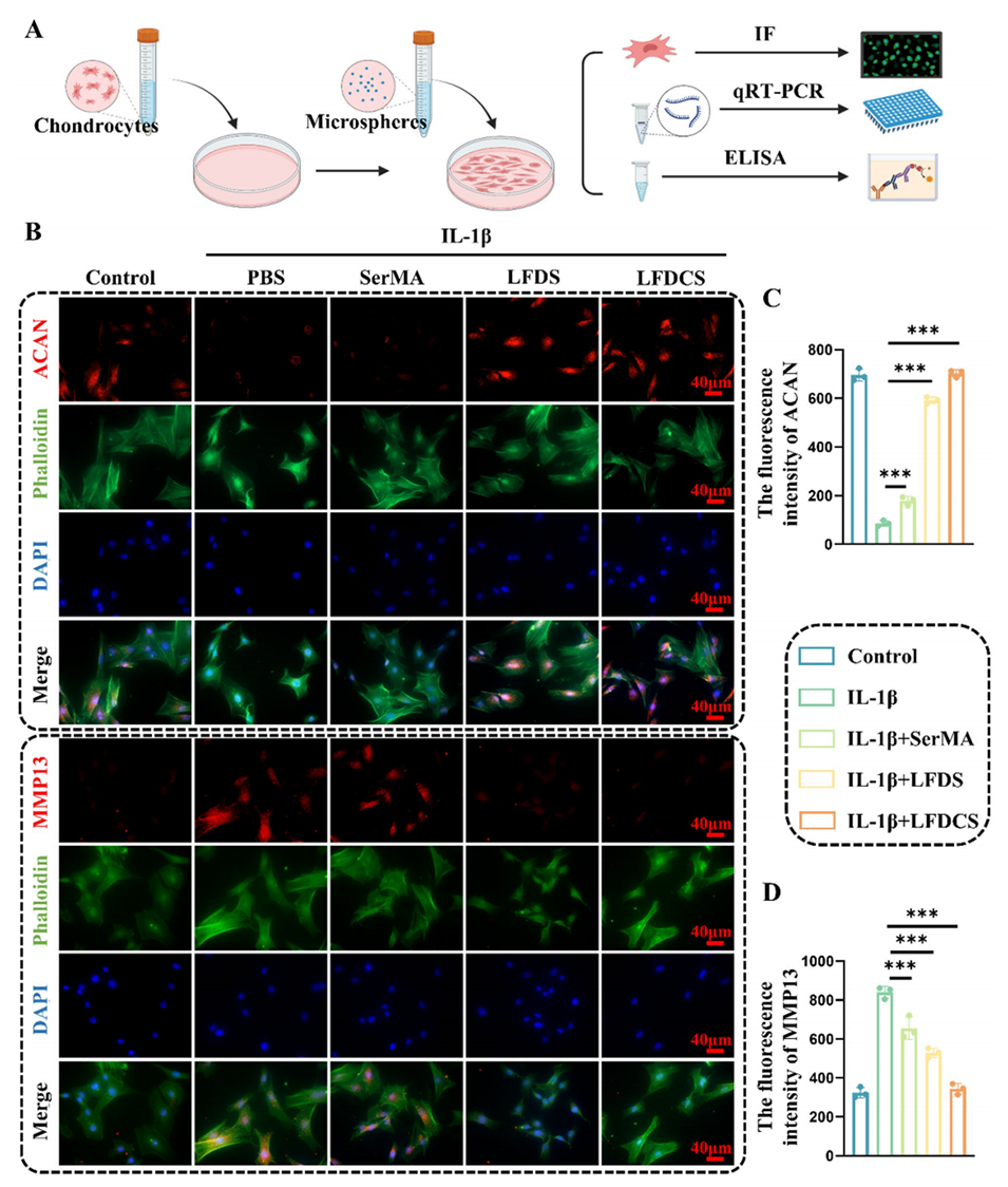 图5. LFDCS上调软骨细胞中ACAN表达并下调MMP13表达。(A) LFDCS干预IL-1β诱导软骨细胞的示意图。(B)免疫荧光(IF)检测软骨细胞中ACAN和MMP13的表达。(C, D)软骨细胞中ACAN和MMP13表达的定量分析(n=3)。***p<0.001