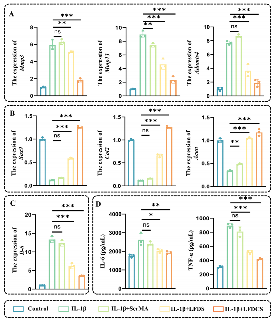 图6. LFDCS改善IL-1β诱导的软骨细胞功能障碍。(A) qRT-PCR检测软骨细胞分解代谢相关基因(Mmp3、Mmp13和Adamts4)的表达。(B) qRT-PCR检测软骨细胞合成代谢相关基因(Sox9、Col2和Acan)的表达。(C) qRT-PCR检测软骨细胞炎症基因Il-6的表达。(D) ELISA检测IL-6和TNF-α的浓度。*p<0.05,**p<0.01,***p<0.001,ns表示无显著差异