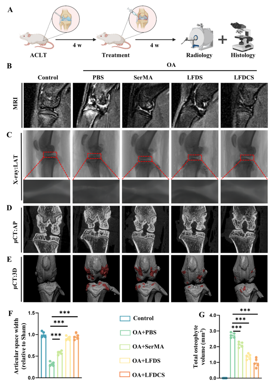 图7. LFDCS减少OA大鼠关节内液相信号和骨赘形成。(A) LFDCS治疗流程示意图。(B) MRI扫描检测关节腔水肿情况。(C) X射线扫描检测关节表面,LAT表示侧位。(D)显微CT(µCT)扫描检测关节表面,AP表示前后位。(E) µCT扫描的膝关节三维重建图像。(F)大鼠内侧软骨间隙宽度的X射线定量分析(n=5)。(G)大鼠膝关节总骨赘的定量分析(n=5)。***p<0.001