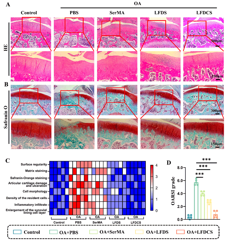 图8. LFDCS减轻OA大鼠的软骨磨损。(A) OA大鼠关节表面磨损的H&E染色。(B) OA大鼠软骨表面的番红O(SafraninO)染色。(C)组织学评分变量的热图(n=5)。(D)大鼠关节的OARSI分级(n=5)。***p<0.001