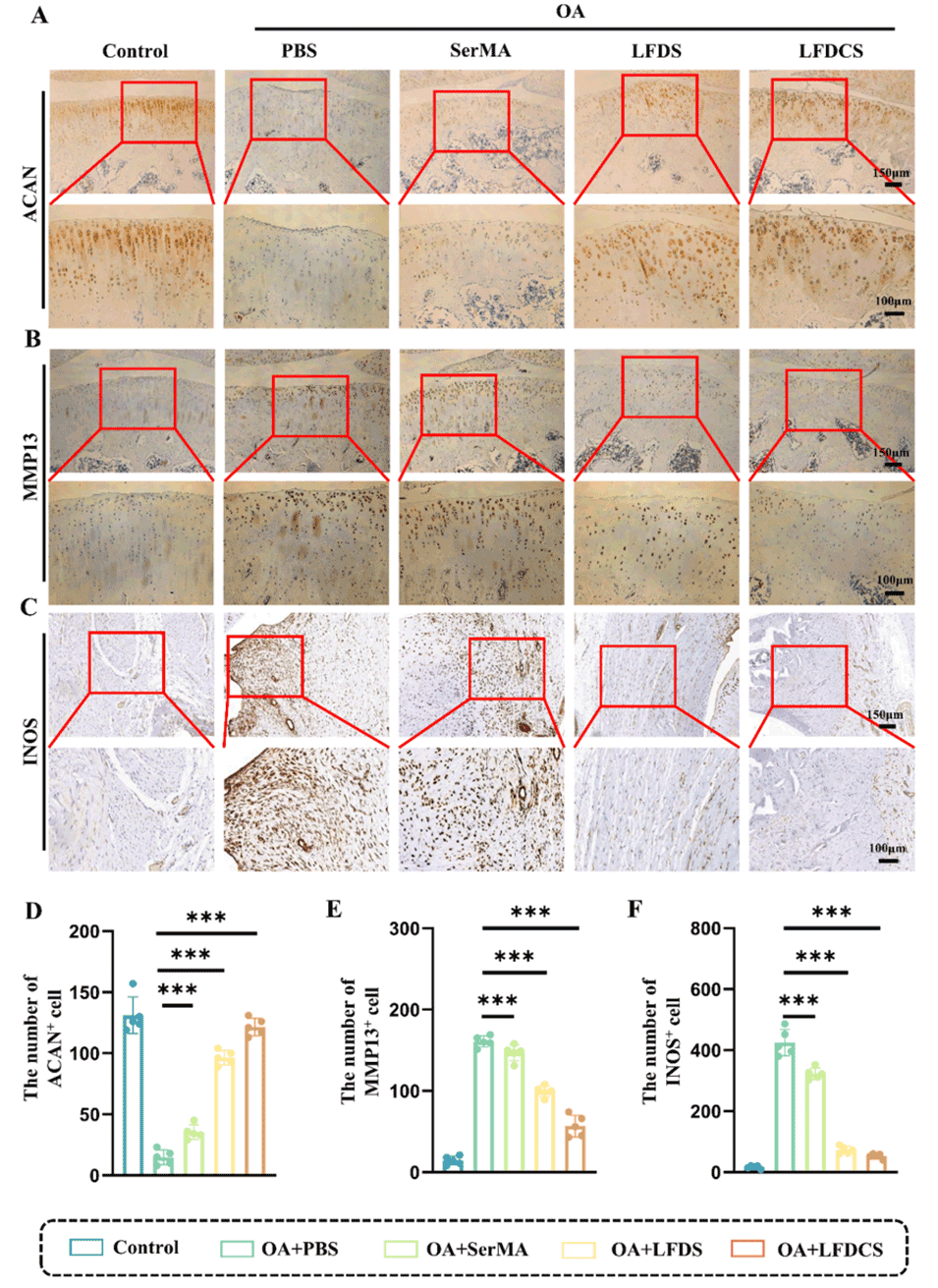 图9. LFDCS改善软骨功能并减轻OA大鼠的滑膜炎症。(A-C)免疫组化(IHC)检测大鼠关节中ACAN、MMP13和INOS的表达。(D-E) IHC检测ACAN、MMP13和INOS数量的定量分析(n=5)。***p<0.001
