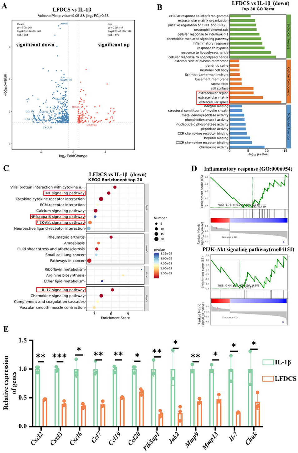 图10.有无LFDCS处理的IL-1β诱导软骨细胞的RNA测序分析。(A)火山图分析IL-1β组和LFDCS组之间的差异表达基因(DEGs)。(B) GO富集分析IL-1β组和LFDCS组之间DEGs的细胞组分。(C) KEGG富集分析IL-1β组和LFDCS组之间DEGs的信号通路。(D) IL-1β组和LFDCS组之间DEGs中炎症反应和PI3K-Akt信号通路的基因集富集分析(GSEA)。(E) qRT-PCR检测Cxcl2、Cxcl3、Cxcl6、Ccl7、Ccl19、Ccl20、Pik3ap1、Jak2、Mmp9、Mmp13、Il7、Chuk的表达(n=3)。*p<0.05,**p<0.01,***p<0.001。IL-1β表示用IL-1β处理的软骨细胞;LFDCS表示用IL-1β和LFDCS浸出液处理的软骨细胞
