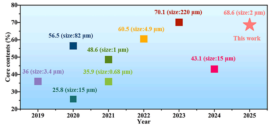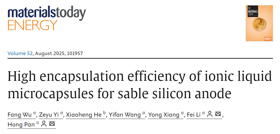 近期,电子科技大学李飞副教授和潘虹博士等人设计了一种高封装效率的离子液体微胶囊(IL-MS),通过优化核壳结构实现了68%的封装效率,并将其应用于硅负极体系中,显著提升了电极的循环稳定性和倍率性能,为解决硅负极体积膨胀难题提供了新策略。相关研究以“High Encapsulation Efficiency of Ionic Liquid Microcapsules for Stable Silicon Anode”为题发表于期刊《Materials Today Energy》。