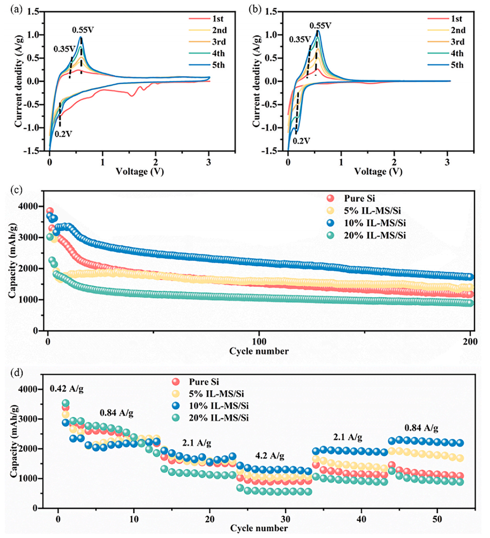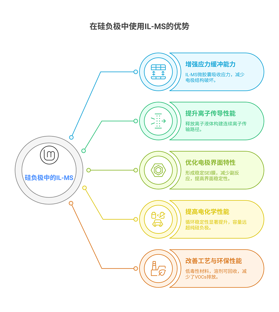 2、所得IL-MS可均匀分散在硅负极中,以重建锂离子传导路径并增强其循环稳定性。