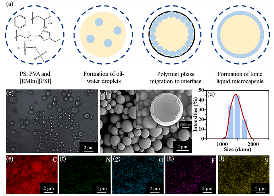 图1.(a)微胶囊制备示意图;(b)微胶囊的光学显微镜照片;(c)正常微胶囊和破损微胶囊的扫描电子显微镜图像,插图为破裂微胶囊的放大视图;(d)微胶囊的动态光散射(DLS)纳米粒度分析;微胶囊壳层的能谱(EDS)元素分布:C(e)、N(f)、O(g)、F(h)、S(i)。