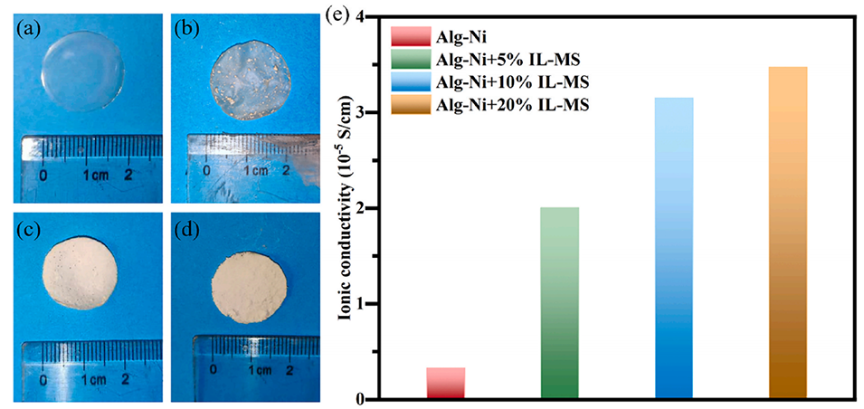 图4.不同微胶囊含量的固体膜光学照片:(a)Alg-Ni(b)Alg-Ni+5%微胶囊(c)Alg-Ni+10%微胶囊(d)Alg-Ni+20%微胶囊;(e)不同IL-MS含量的固体膜电池的离子电导率。