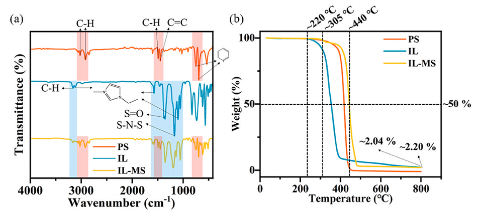 图3.(a)[EMIm][FSI]离子液体、聚苯乙烯(PS)壳层和IL-MS微胶囊的傅里叶变换红外光谱(FTIR);(b)热重分析(TGA)曲线。