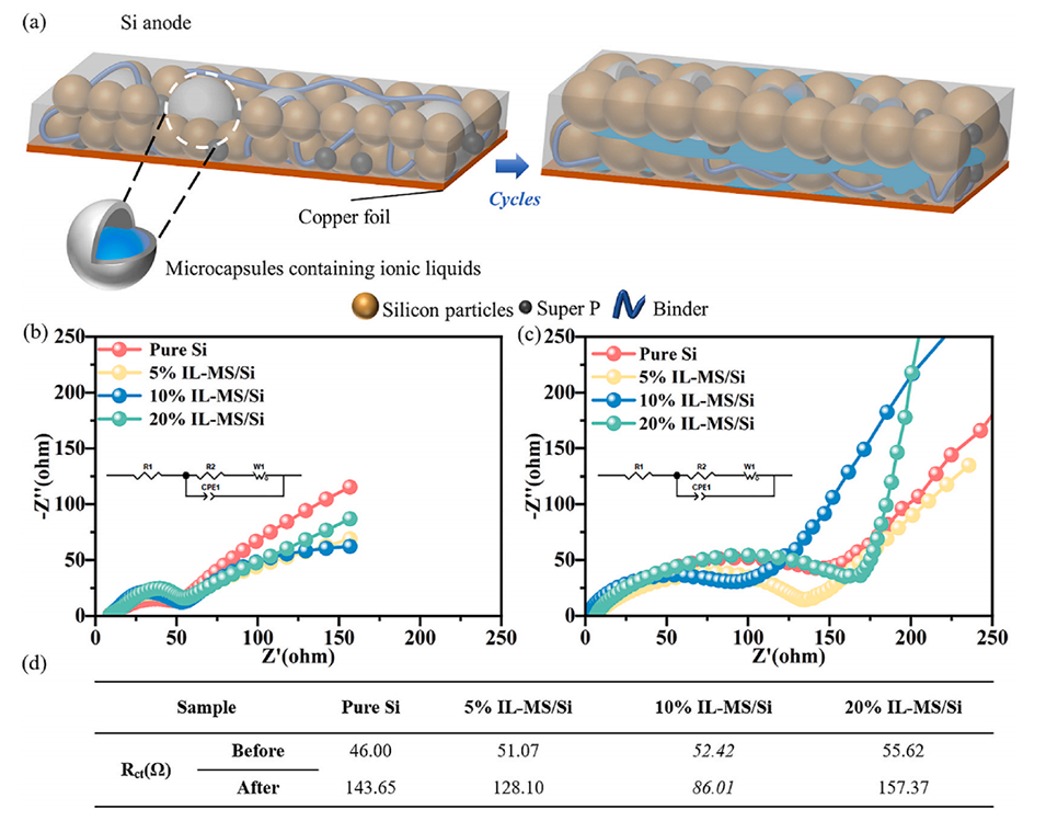 图6.(a)IL-MS在硅电极中的作用机制示意图;奈奎斯特图(b)循环前和(c)循环后,(d)循环前后电荷转移电阻(Rct)对比。