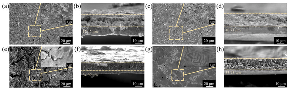 图7.纯硅电极(a, b)循环前和(c, d)10wt% IL-MS/Si电极的扫描电子显微镜图像;纯硅电极(e, f)循环后和(g, h)10wt% IL-MS/Si电极的扫描电子显微镜图像。