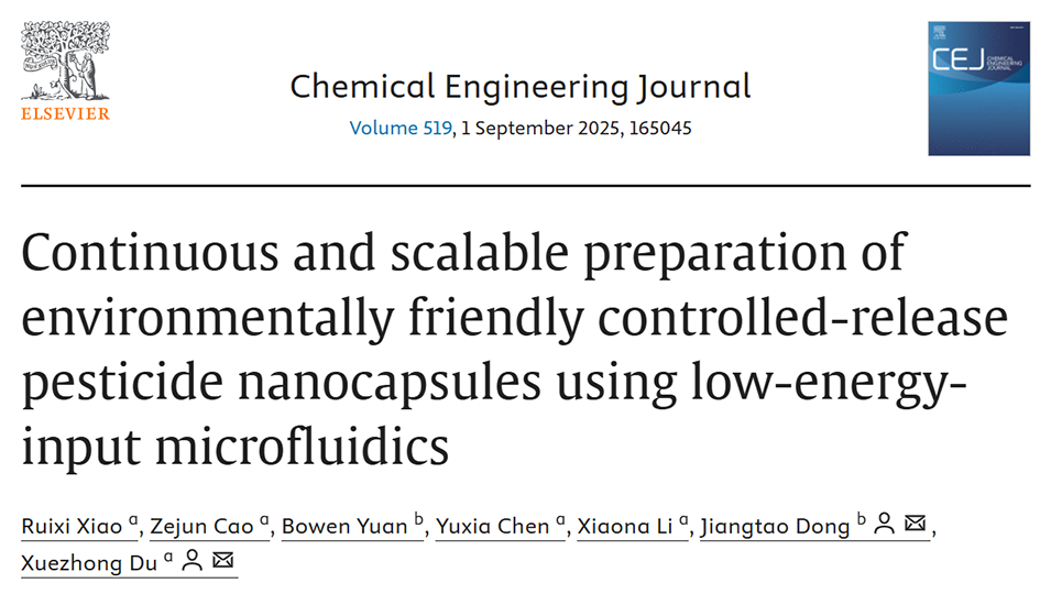 近期,南京大学杜学忠教授团队与河南科技学院董江涛等人合作,开发出一种低能耗微流控平台,实现了环保型控释农药纳米胶囊的高通量连续制备。该纳米胶囊不仅具备优异的光热转换性能与多重刺激响应控释能力,还在杀菌效果与生物安全性上显著优于传统农药制剂,为绿色可持续农业提供了新的技术方案。相关研究以“Continuous and scalable preparation of environmentally friendly controlled-release pesticide nanocapsules using low-energy-input microfluidics”为题目,发表在期刊《Chemical Engineering Journal》上。